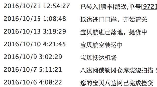 顺利收到货,这次与预料的快不少,总算能在元旦的时候有新衣服穿了<img src="http://www.8dexpress.com/Statics/Js/Ubbeditor/common/theme/default/images/smiley/14.gif">