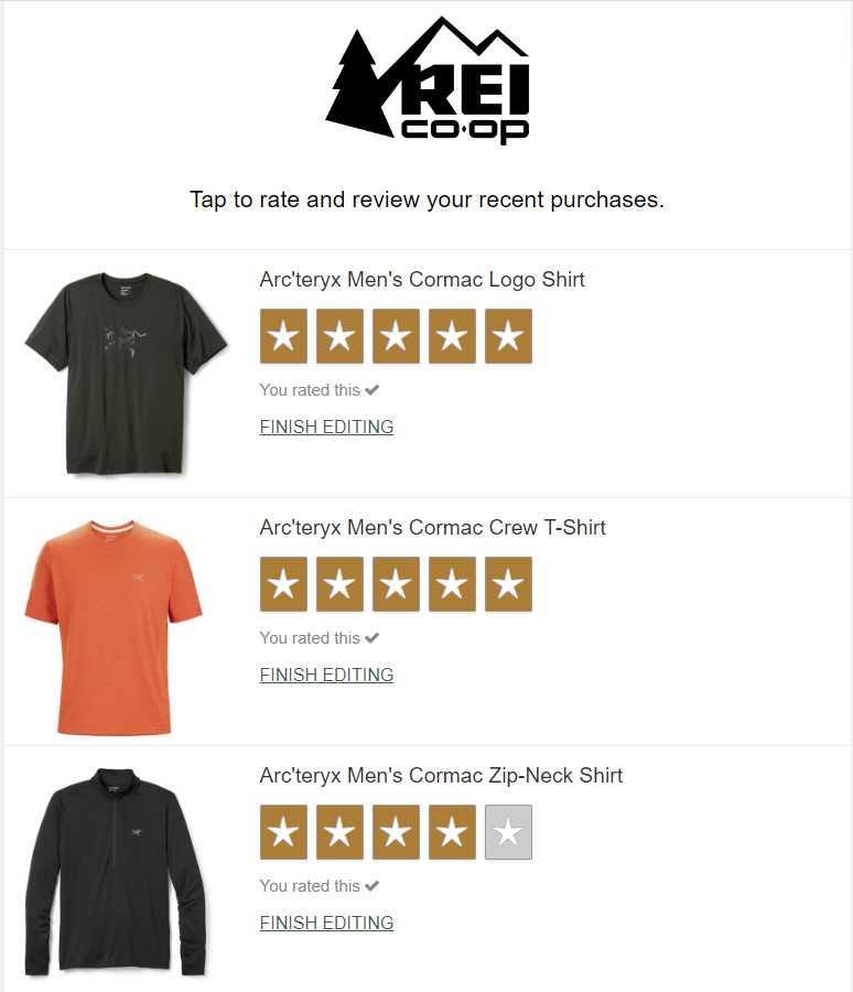 <p>购于rei平台,感谢美帝,感谢八达网</p><p>两件短袖速干T恤,一件半拉链速干长袖,价格太美丽了</p>